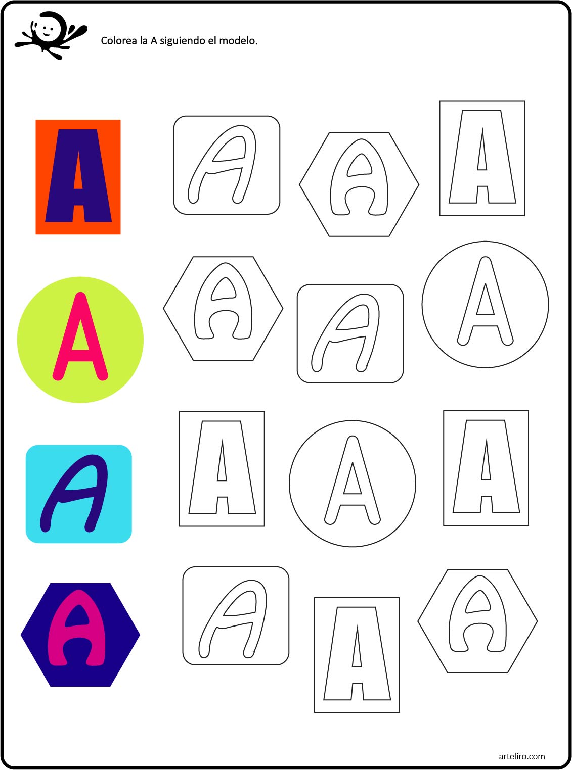 Un buen método educativo para enseñar las primeras letras estará siempre acompañado de amor, arte y alegría.Coloreando la A de árbolColoreando la E de elefanteColoreando la i de iguanaColoreando la O de osoColoreando la U de uvaColorea la letra A- Ejercicio para que el niño siga los puntos y después coloree. Permite trabajar también figura y fondo.Colorea la Letra E.Colorea la letra i.Colorea la O. Ejercicio con seguimiento de puntos.Colorea la letra U. Ejercicio de seguimiento de puntos.La Enseñanza es un arte y debe estar llena de creatividad, diversión, entusiasmo y acorde a la madurez del niño.Vocal AVocal EVocal IVocal OVocal U